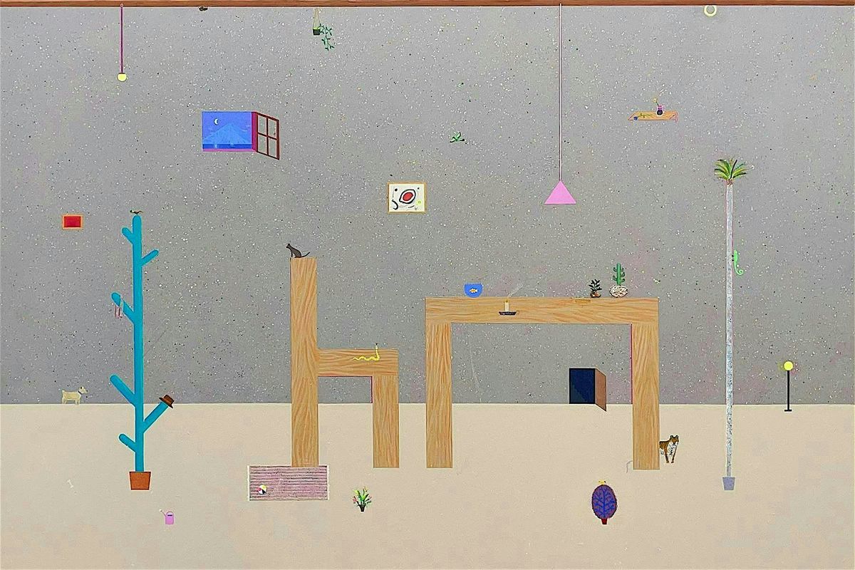 At first glance, Aitor’s playful, cartoony, oneiric acrylic-on-canvas paintings appear figurative and tightly composed, relying heavily on narrative tension and visual appeal. They unfold as dreamlike tableaux populated by recurring iconographic elements: human figures, horses, celestial bodies, domestic furniture and objects, clothing, parks, cityscapes, plants, and everyday items. Beneath this apparently flat appearance, the surface opens into multiple layers rich with texture—drips, splatters, bumps, and accidents—carefully constructed and physically present in his work.