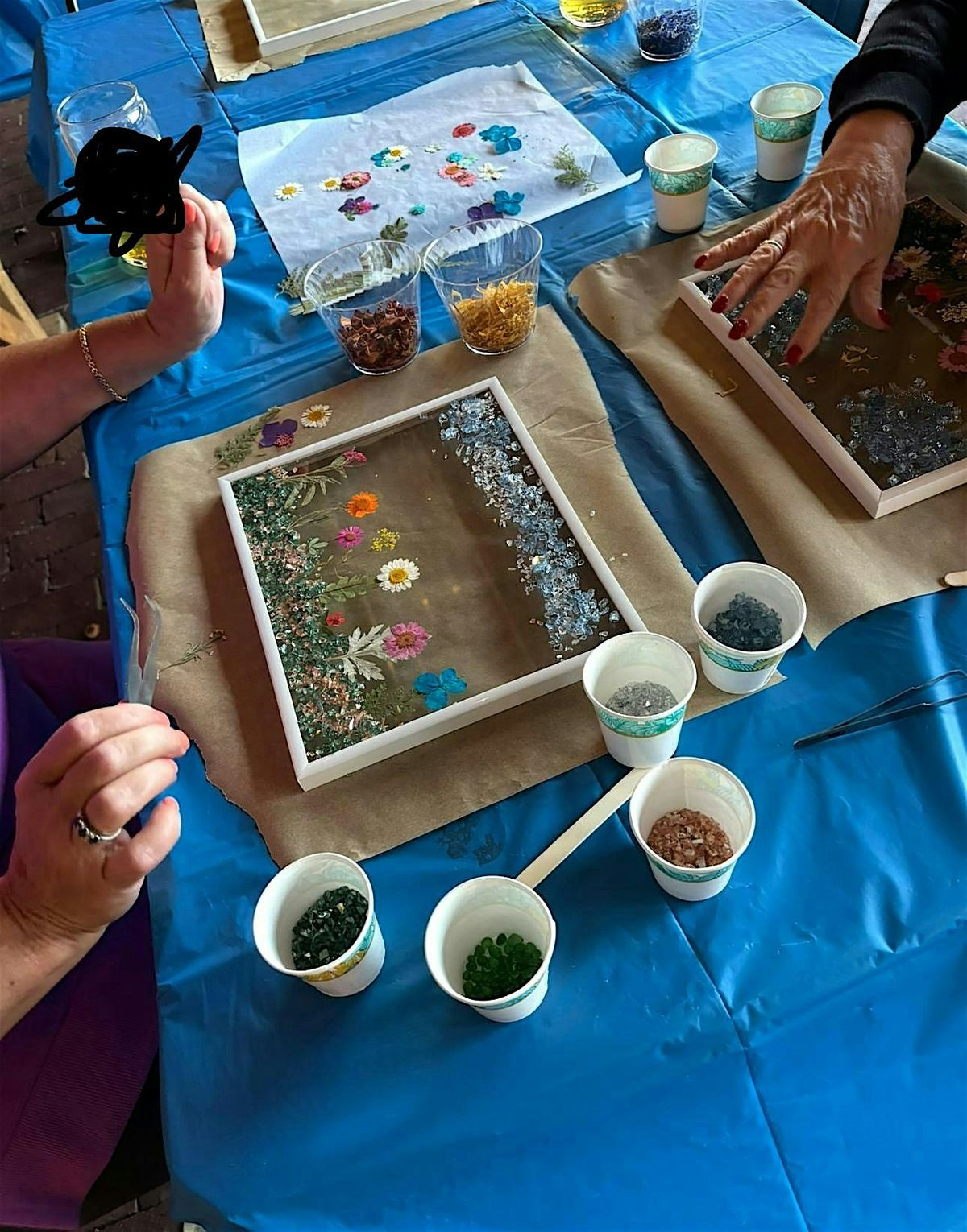 Don't worry about bringing any materials – we'll provide all the necessary supplies, including resin, dried wild flowers, dried rose, lavander and camamile pedals, paper flowers, sea glass, mosaic accents, pebbles, rocks, sand , sea shells and more.