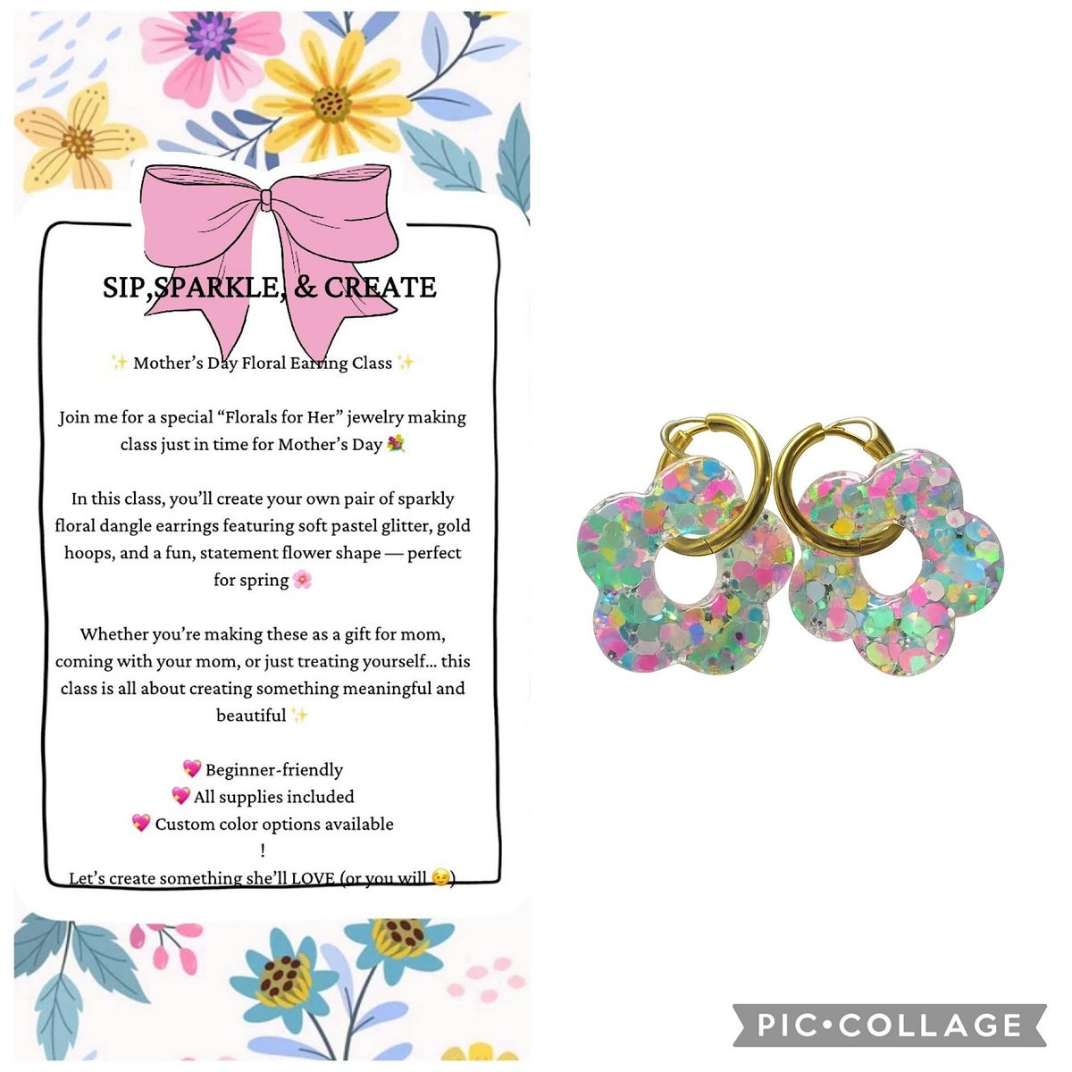 you’ll create your own pair of sparkly floral dangle earrings featuring soft pastel glitter, gold hoops, and a fun, statement flower shape — perfect for spring
