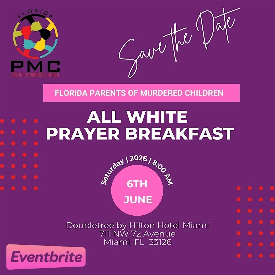 Join us for this heartfelt event at the ALL WHITE PRAYER BREAKFAST, hosted by Florida Parents of Murdered Children. It’s a special time to come together and find comfort through prayer, community support, song and words of inspiration. Let’s lift up these parents and provide encouragement and motivation as they navigate their loss.