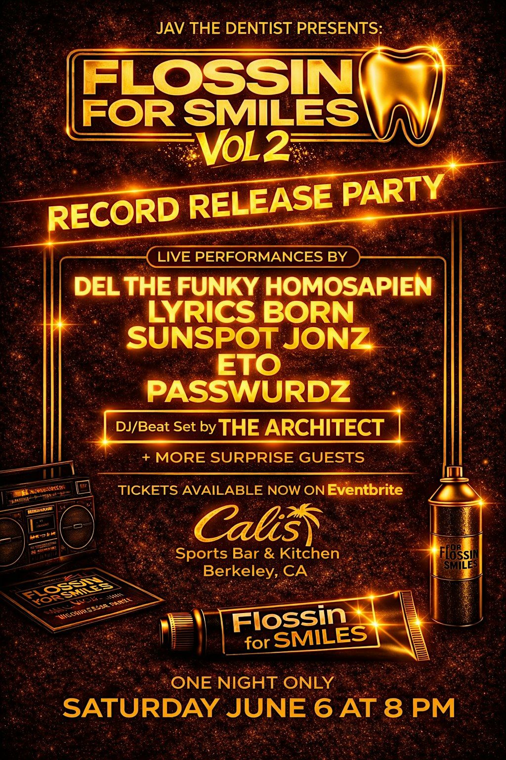 Live hiphop perfomances and record relase party supporting kid's dental care through Flossin for Smiles. One night only in Berkeley