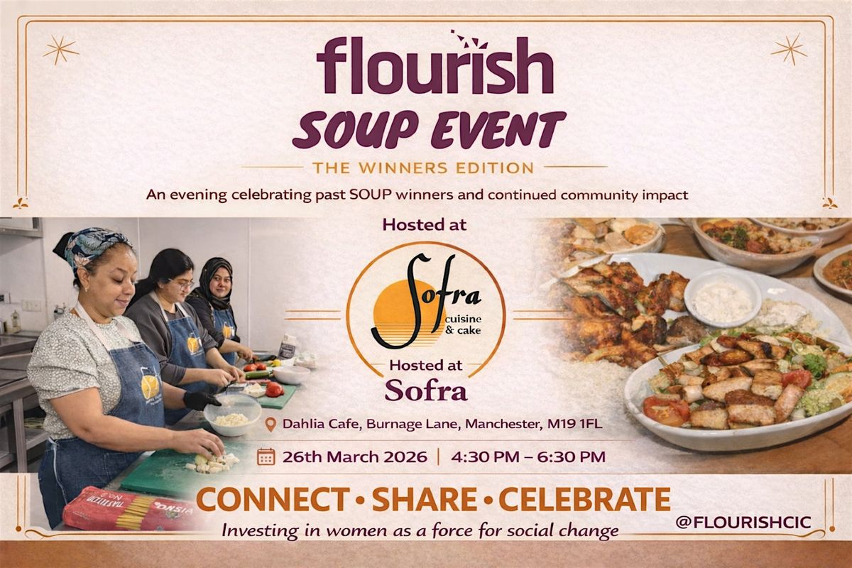 Support Greater Manchesters up-and-coming social entrepreneurs as we celebrate past winners of Flourish SOUP 'pitch for cash' events and hear them pitch once again for a cash award to further their social venture. Socialise, network, learn about exciting work happening in the region, and enjoy delicious food from a fantastic community cafe.