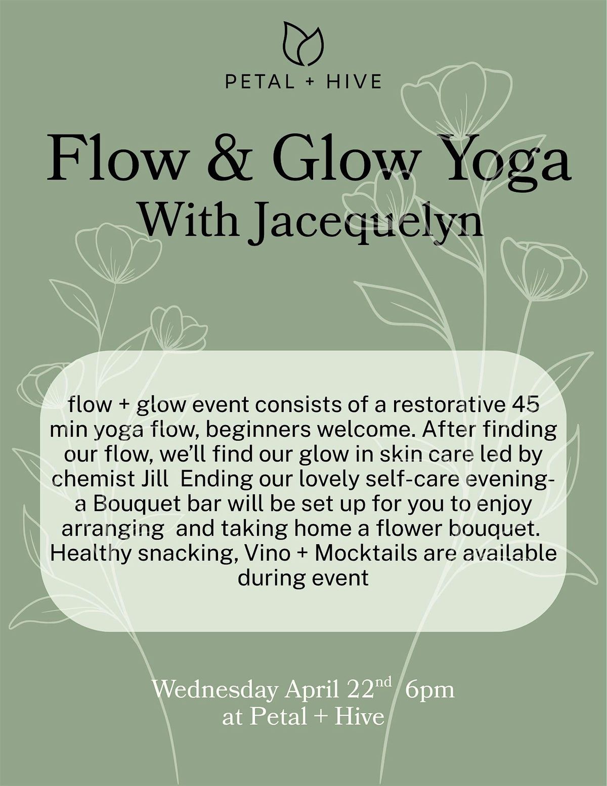 Flow + Glow event consists of a restorative 45 min yoga flow, beginners welcome.