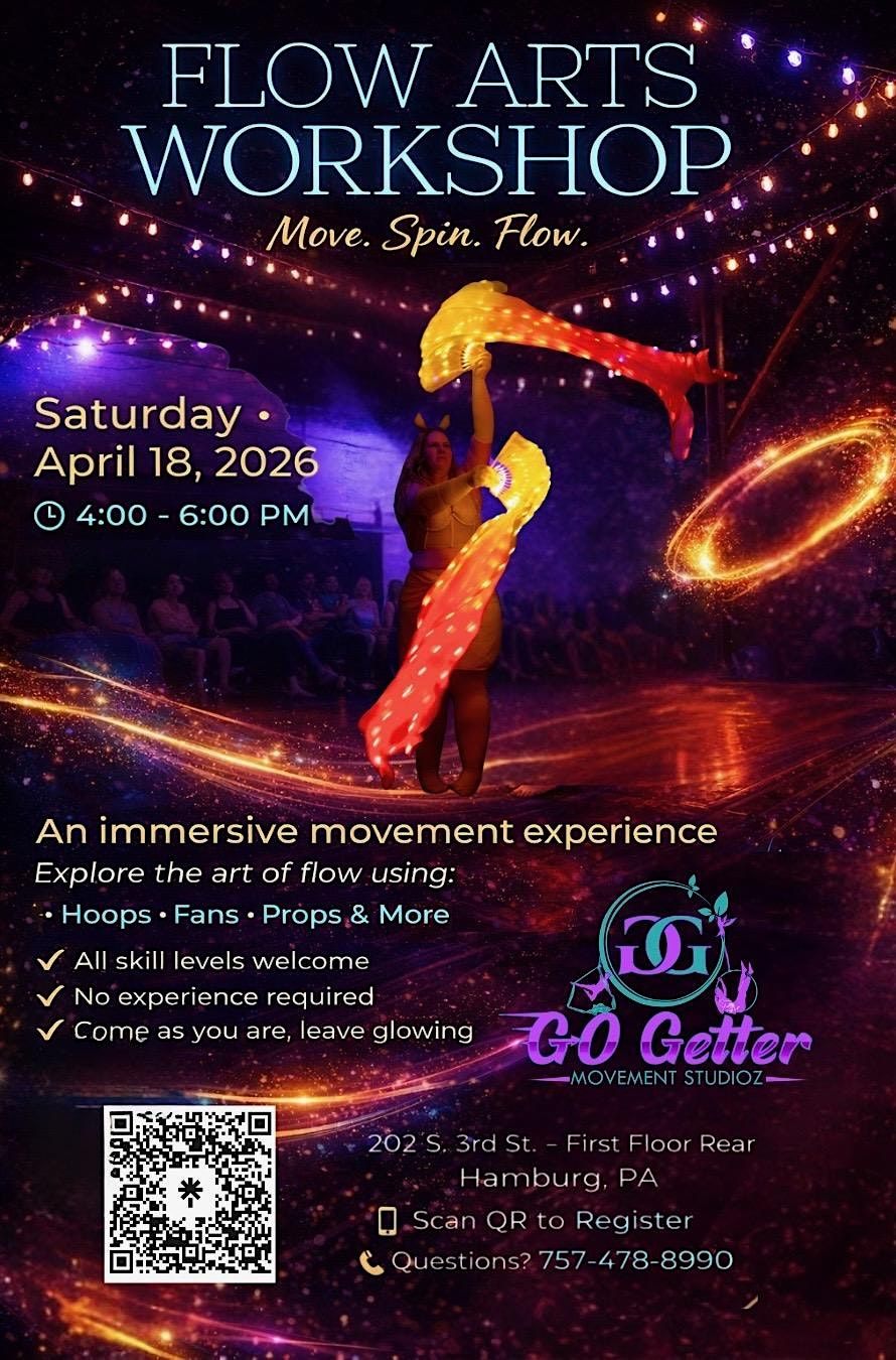 Welcome to the Flow Arts Workshop happening at Go Getter Movement Studioz! Get ready to immerse yourself in the world of flow arts on April 18th, 2026 at 4:00 PM (Eastern Time).