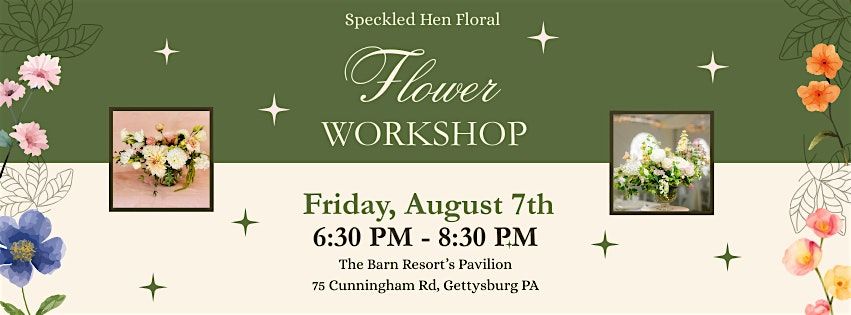 Get ready for a flower‑filled evening on Friday, August 7th from 6:30pm–8:30pm at The Barn Resort in Gettysburg. This lively Flower Arranging Workshop—taught by local wedding florist and flower farmer Speckled Hen Floral—invites you to sip, snack, and create. For $68, you’ll enjoy a drink, small bites, and all the blooms, supplies, and guidance you need to design an elegant garden‑inspired centerpiece that radiates summertime charm. Expect a fun, hands‑on experience that blends creativity, relaxation, and a touch of floral magic. Get your tickets using the link below!