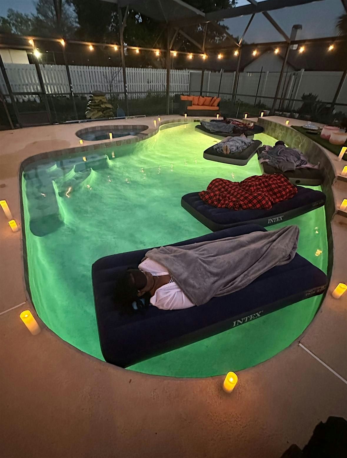 Enjoy a beautiful floating sound bath in a peaceful environment. Listen to the birds chirp and the wind blowing connecting to nature as you enter serenity and bliss. This is the perfect Friday night if youre looking to relax and calm your mind unwinding from a long week. Good vibes and atmosphere you will experience sound healing at its finest level. Fresh farm to table mint tea will be brewed for everyone after the sound bath. There are non floating spots available as well on zero gravity chairs and a lounge chair if want to enjoy the sound bath without getting in the pool. Sound bath will be at a private residence, address and gate code will be Emailed when tickets are purchased.