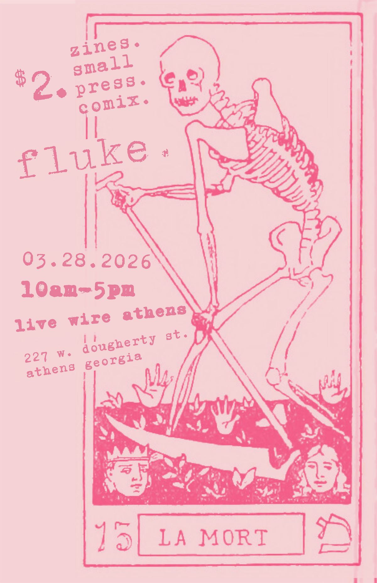 The 23rd mostly-annual FLUKE small press / comix / 'zine fest will take place on March 28, 2026 from 10:00am - 5:00pm at Live Wire Athens (227 W. Dougherty Street) in downtown Athens, Georgia.Lottery entries for Exhibitor Spaces at FLUKE 2026 are on sale now.There's no need to hurry. They'll be on sale until Sunday January 11.Remember, no matter how many entries we sell, we only have 60 exhibitor spaces available.YOU CAN ONLY BUY ONE LOTTERY ENTRY. Orders of more than one entry will be cancelled. Please don't use trickery to buy more than one entry. We will eventually find out and that won't be fun for anyone.You can buy lottery entries right now at flukeathens.bigcartel.com.The drawing will be live-streamed on our official streaming partner JOKER JOKER TV on January 15.If you enter the lottery, you will receive an email before the drawing which tells you your entry number. That's the number you want to see pulled out of the bucket on Joker Joker TV.We really want you to watch the drawing, but if you can't, don't worry. We will email everyone within 48 hours of the drawing's conclusion and let them know whether or not they were selected.