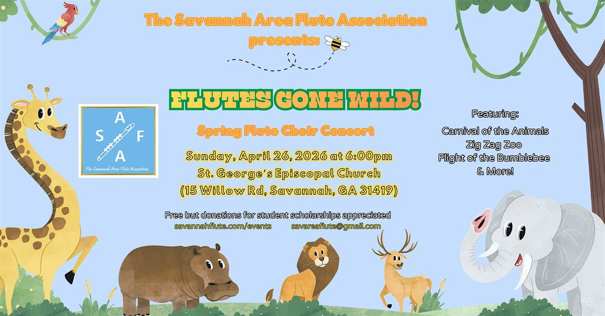 Go a little wild and join the Savannah Area Flute Association for their spring flute choir concert featuring music all about animals, including Carnival of the Animals, Flight of the Bumblebee, Swan Lake, Zig Zag Zoo, and more!
