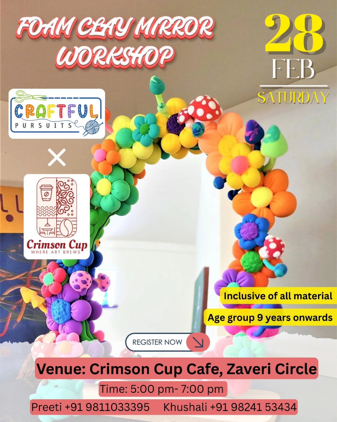π¨ Unleash your creativity at the Foam Clay Mirror Art Workshop hosted by Crimson Cup Cafe! π Join renowned artists Preeti & Khushali for an immersive art experience designed for all age groups. ποΈ