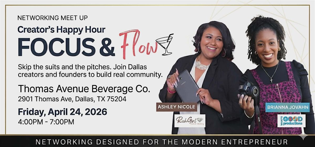Join us for the Creator’s Happy Hour: FOCUS & FLOW! Whether you’re a Dallas founder or a creative looking for your tribe, this is the space