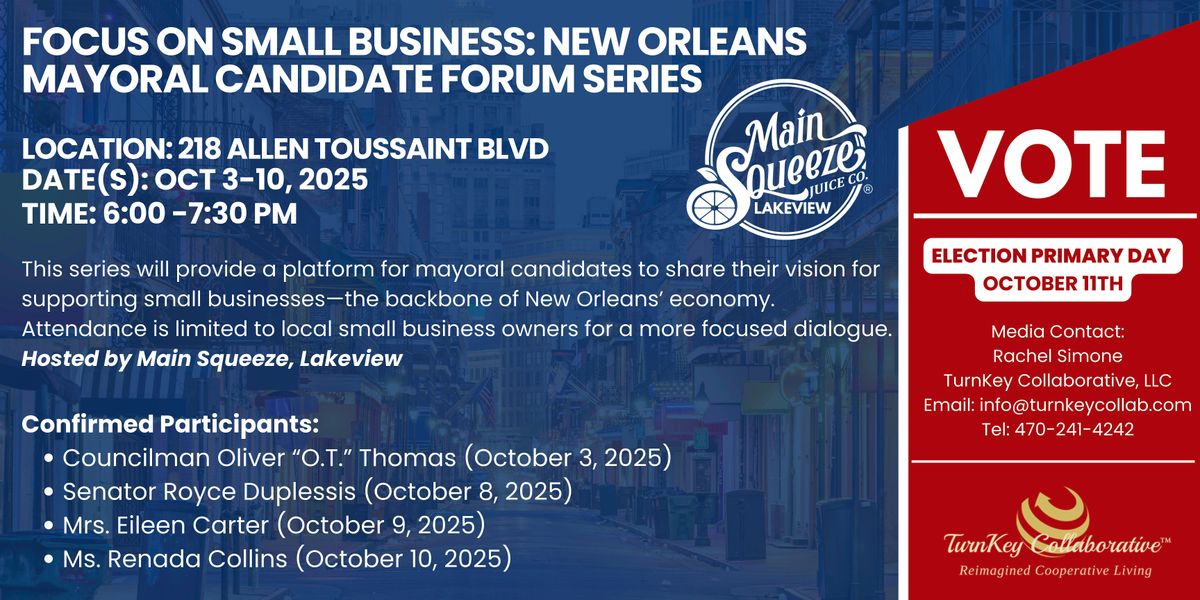 TurnKey Collaborative, LLC, in partnership with Main Squeeze Juice Company (Lakeview location), will host “ Focus on Small Business: New Orleans Mayoral Candidate Forum Series,” taking place on October 3–10, 2025. The forums will be held from 6:00 PM to 7:30 PM on weeknights at Main Squeeze’s Lakeview location, featuring one candidate per event.