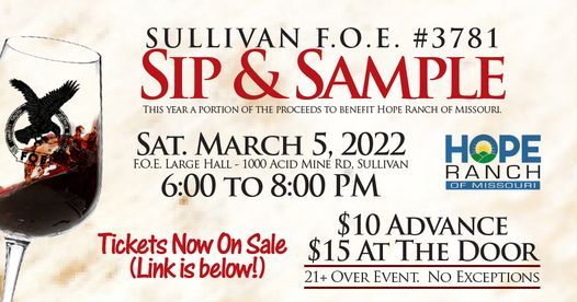 Join us for our 9th Annual Sip & Sample on March 5, 2022 6-8pm!Tickets: $10 Advance - $15 @ Door - available for purchase at FOE #3781 (1000 Acid Mine Rd, Sullivan, MO) or using ticket purchase link below