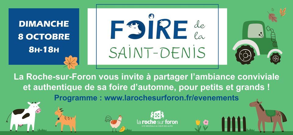 La traditionnelle Foire de la Saint Denis, fête alimentaire et agricole de Haute-Savoie, s'installe une nouvelle fois en centre-ville de La Roche-sur-Foron le dimanche 8 octobre 8h-18h.Pour cette édition 2023, vous retrouverez plus de 100 exposants & commerçants Rochois ! En plus des animations pour petits et grands qui auront lieu toute la journée.
