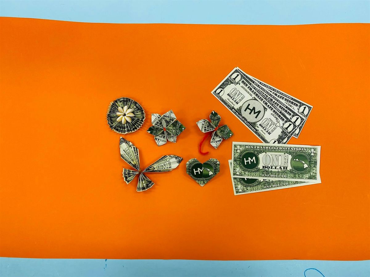 Add new or renewed skills to your origami and graduation lei game by learning how to fold money into cool and decorative shapes. You will have papers, a specialized folding tool, and time to practice each of four shapes: heart, butterfly, multi-petal flower, and classic accordion-fold flower. Other shapes and styles will also be discussed and shown. You will go home with reference handouts, your remaining paper, and with finished final samples of each shape, made from our own HouseMart Ben Franklin fun money!