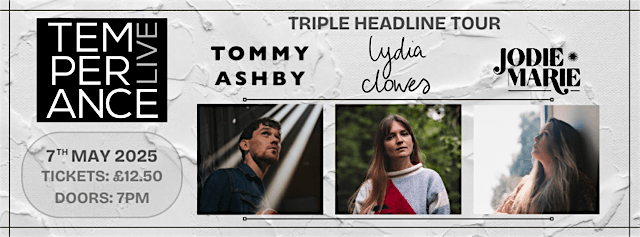 Tommy Ashby, Jodie Marie and Lydia Clowes come together for their first triple headline tour. They will join forces for just a few special UK shows to play a mixture of each of their own songs. Having worked individually with the likes of Jamie Lawson, Ed Harcourt and Will Young, these three will bring a piece of Scotland, Wales and England (Leamington Spa!) to Temperance. Expect a combination of folk, blues and lots of lush harmonies!