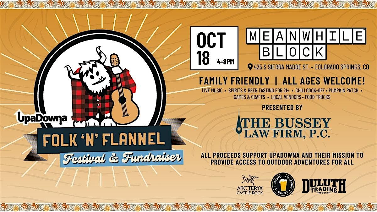 Put on your favorite flannel and join us for UpaDowna’s annual Folk’n’Flannel Festival & Fundraiser at The Meanwhile Block in Downtown Colorado Springs! Enjoy live music, taste and vote in the chili cook-off, make fall-themed crafts, play games including inflatable archery, and sip local brews in the beverage garden. Celebrate the season with family-friendly fun while supporting UpaDowna’s mission to make outdoor adventures accessible for all.