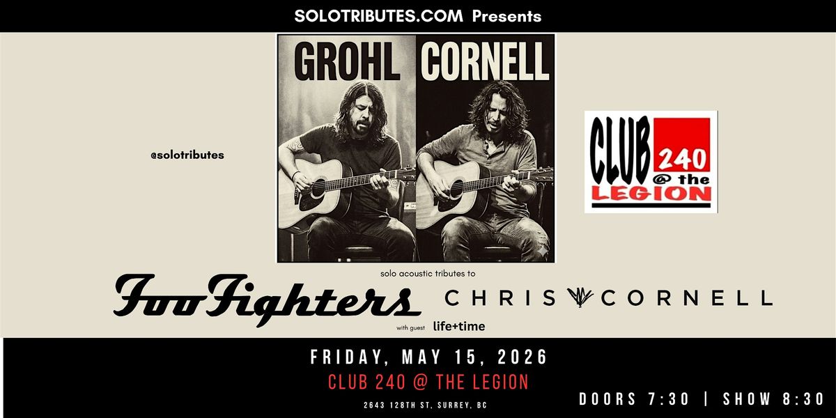 Get ready for an epic night celebrating the music of Foo Fighters and Chris Cornell unplugged! Join us in person at Club 240 Crescent Beach for your favorite songs from Foo Fighters and the Chris Cornell songbook from Soundgarden, Audioslave, Temple of the Dog, and his solo hits. Special Guest life+time solo acoustic. Don’t miss out on this unforgettable event with an awesome vibe and great company. See you there! Doors at 7:30, show at 8:30.