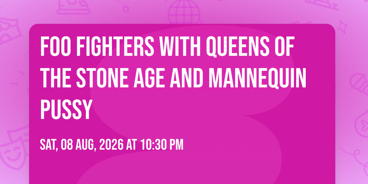 π Location: 41.8623, -87.6159π Welcome to Foo Fighters with Queens of the Stone Age and Mannequin Pussy, where the impossible becomes possible and dreams take flight! ποΈ Join us at Soldier Field in the heart of Chicago, IL for an event that will redefine your expectations. π On August 8th, 2026 at 10:30 PM, witness the transformation of space and time into something truly magical. β¨ It's a curated experience combining the best of innovation, entertainment, and community spirit, creating moments that will be remembered for years to come. Whether you're a first-time visitor or a seasoned enthusiast, prepare to be amazed. π Book now to ensure your place in this unforgettable experience!