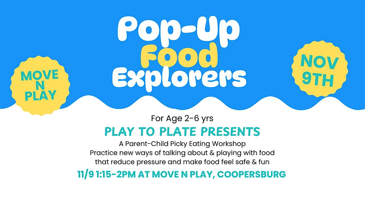 Welcome to Food Explorers Pop-Up at Move N Play! Join us for a parent-child picky eating workshop where you and your little ones can explore new foods together through play and learn how to navigate mealtimes at home with less stress. Available for ages 2-6 (contact info@play2plate for possible age exceptions).
