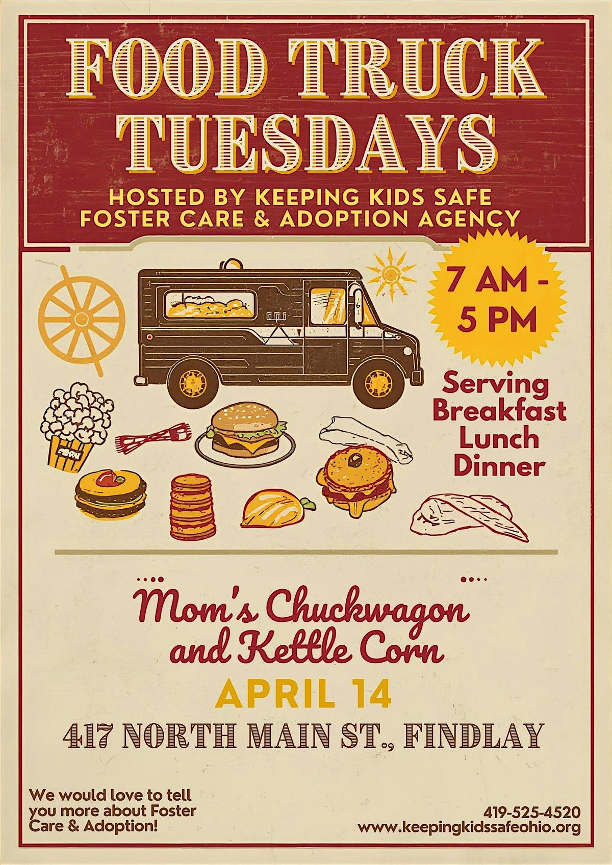 Moms Chuckwagon and Kettlecorn features DELICIOUS options for Breakfast, Lunch, and Dinner! April 14th 7 AM - 5 PM!