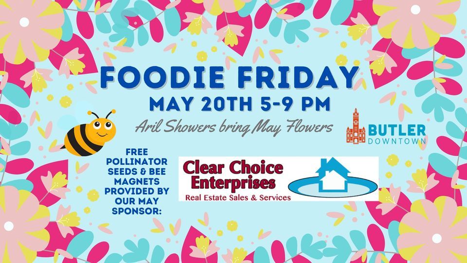 Foodie Friday is a gathering of food trucks in Downtown Butler on the 3rd Friday from May through August presented by the nonprofit group Butler Downtown. Food trucks will be open from 5-9 PM in the parking lot of First English Lutheran Church on Main Street. Live music from Dinnerbell Road Acoustic from 6-8 PM. This month's theme is April Showers Bring MAY FLOWERS! ? ? We are proud that Clear Choice Enterprises is a sponsor. They will be there having fun with us and handing out FREE pollinator flower seeds and bee magnets! ?
