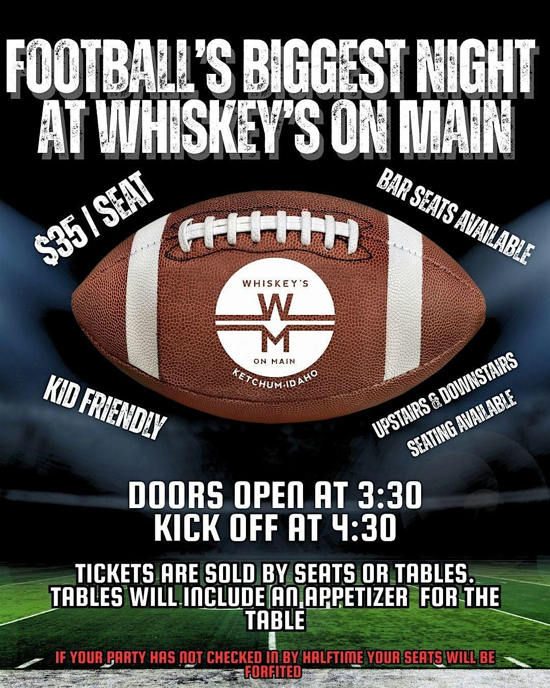 Reserve your seats at Whiskey's on Main for "The Big Game." Tickets will include an appetizer platter for your group, giveaways & more!