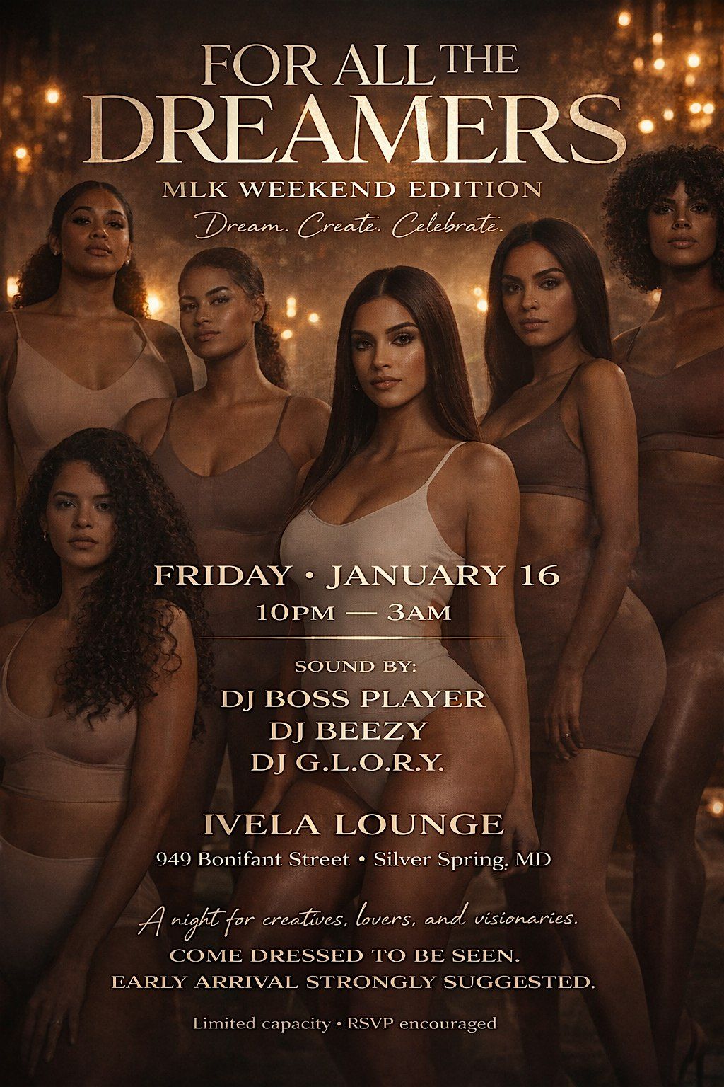 You're cordially invited to come socialize with some of the flyest young professionals of the DMV and beyond. We're turning up to celebrate the legacy of Dr. Martin Luther King Jr. All beautiful dreamers with a positive attitude are welcome. Come conversate and smoke hookah. Or have a drink, or a few ;) Or enjoy our fantastic African cuisine. Or dance the night away. Or all of the above.