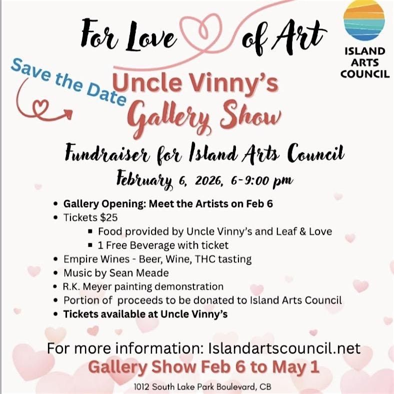 Feb 6, 6-9PM @ 1012 S Lake Park Blvd, CB. Art, music, & food fundraiser for Island Arts Council. $25 tickets @Uncle Vinny’s