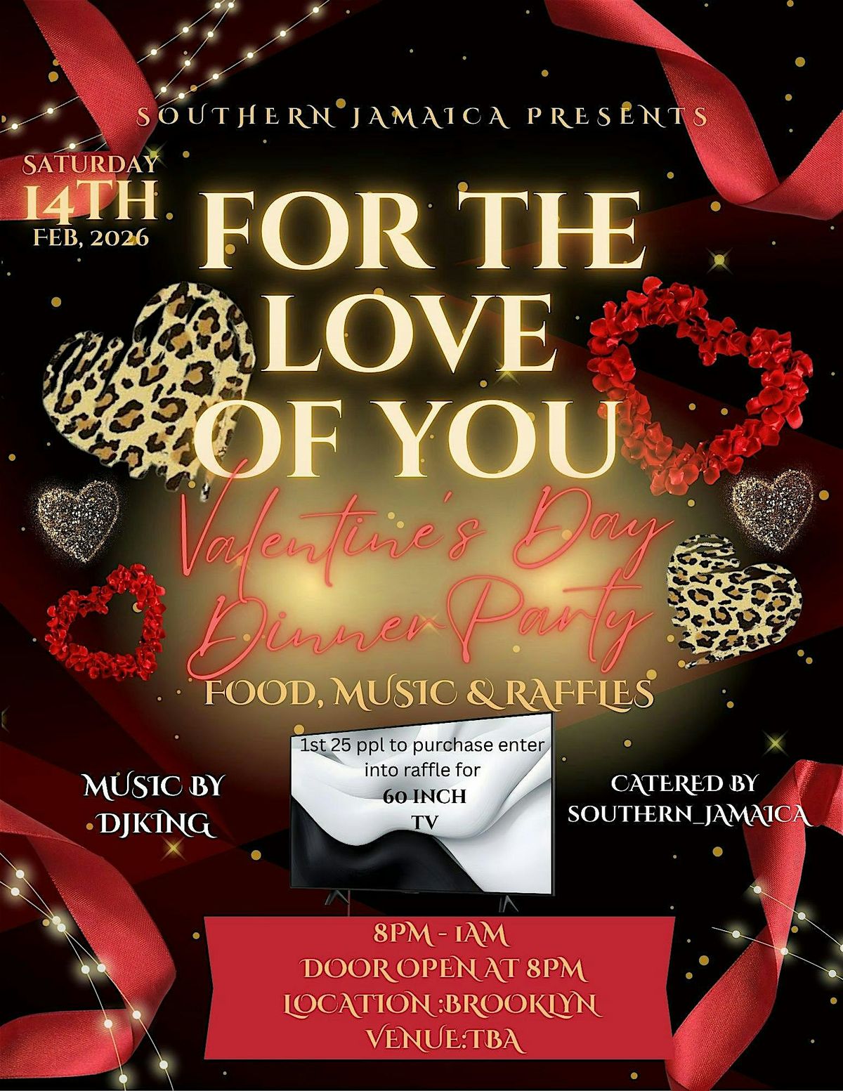 Welcome to For The Love of You! Join us on February 14, 2026 at 7:30 PM for a night filled with love and joy. The venue name will be announced soon, so stay tuned for updates. Let's celebrate love in all its forms together. Whether its with your man,babymama,bestie,favorite cousin or ride-or-die.This is for the people who wish to celebrate but not trying to pay rent cost to do it. Who dont wish to worry about reservation.This event is for you.This event gives you itimate with a splash of fun.Music,Food,Open Bar and Raffles.This is a night you dont want to miss.Mark your calendars and get ready to spread love and positivity.