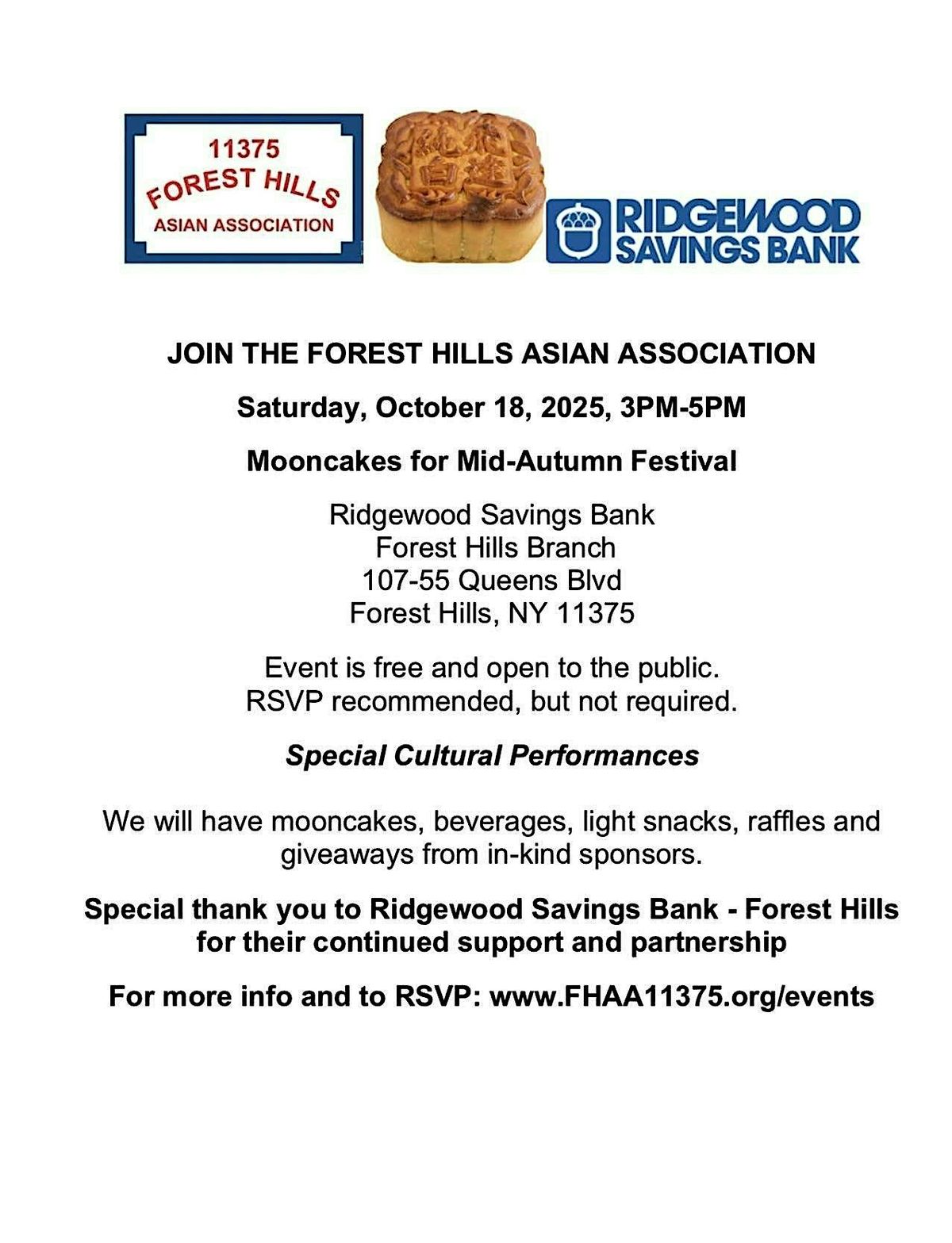 Welcome to the FOREST HILLS ASIAN ASSOCIATION's Mooncakes for Mid-Autumn Festival! Join us at Ridgewood Savings Bank for a delightful evening celebrating this traditional festival. Indulge in delicious mooncakes, enjoy cultural performances, and connect with the community. Don't miss out on this special event!
