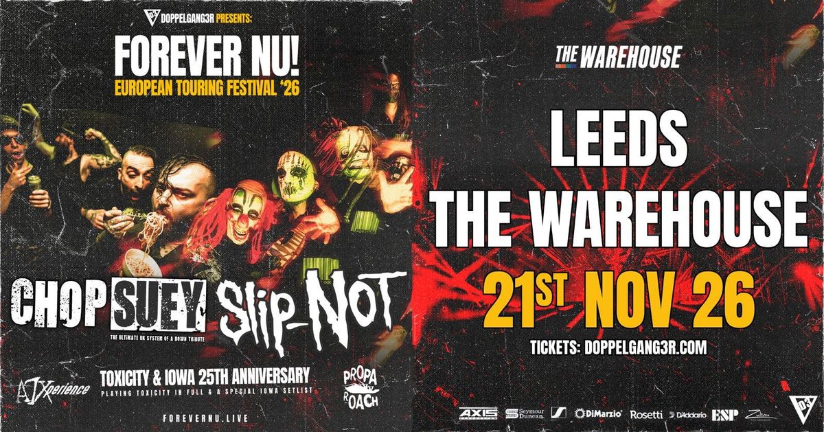 FOREVER NU - 25th anniversary of Toxicity & Iowa special! Chop Suey, Slip-Not, A7Xperience, Propa RoachFeaturing members of Dragonforce, Anti-Nowhere League, Tigertailz and Sinsaenum, Chop Suey and Slip-NOT have cemented themselves as two of the best tribute acts in the UK! This year they are bringing a special show to a city near you, celebrating the 25th anniversary of two of the most iconic metal albums of a generation! Joined by A7Xperience and Propa Roach, this is a night not to miss for fans of 00s metal! Come and join the party and see for yourself just how good a tribute show can be!
