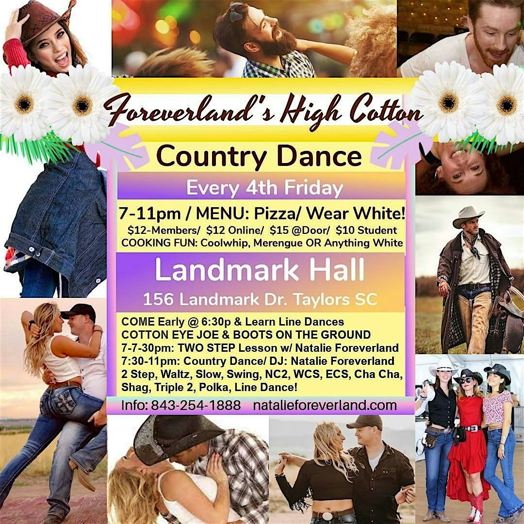 It's Foreverland's High Cotton Country Dance .@ Landmark Hall , 156 Landmark Dr. Taylors, SC!