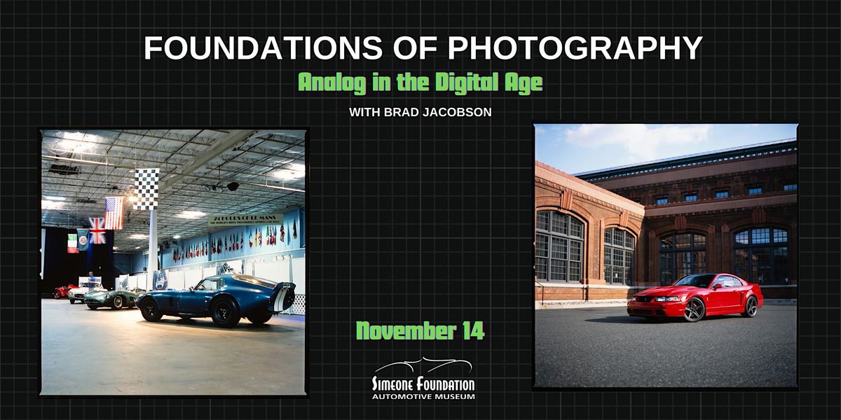 Join Brad Jacobson, the official Demo Day photographer, for a one-session workshop in the museum's Bugatti Room on the morning of November's Demo Day. From 10:30 to 11:30 AM, we'll cover the fundamental differences between analog and digital, walk through the basic operations of typical film cameras, and explore how a photographer in 2026 can shoot film, digital, or both with a practical, integrated workflow.