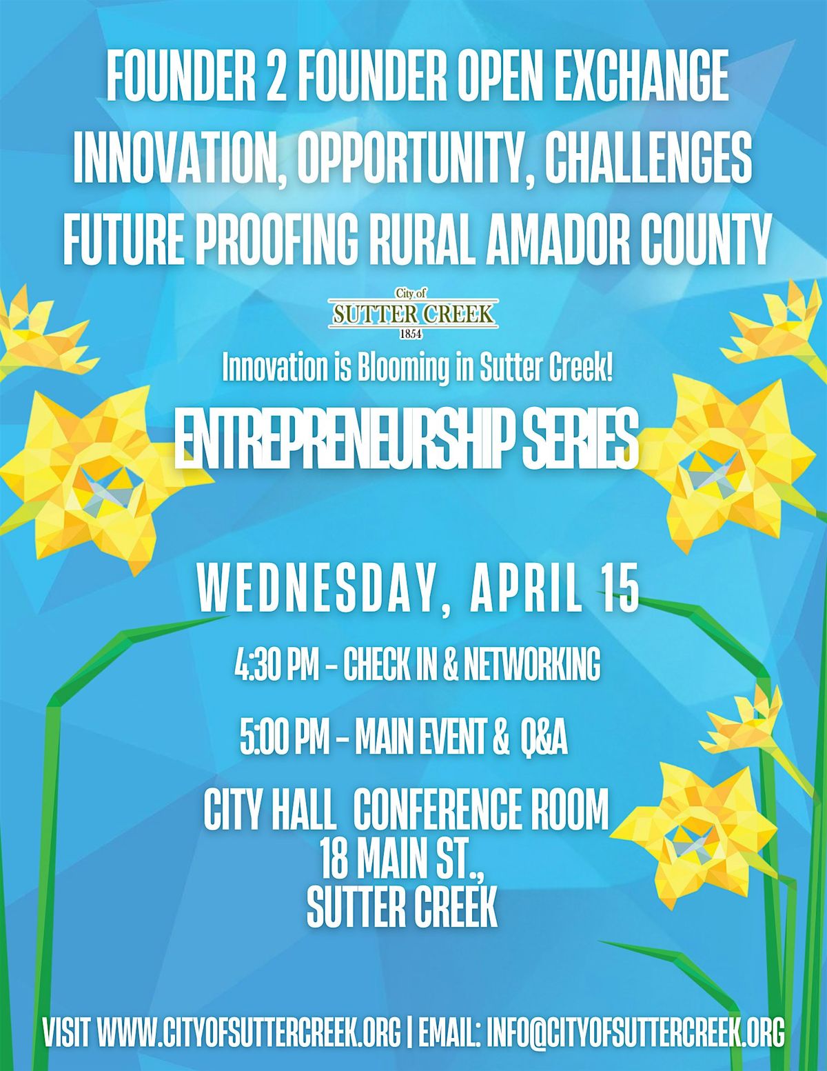Next monthly talk in Sutter Creek entrepreneurship series is an open discussion on challengesApr 15, 5 - 6 PM (Networking at 4:30).