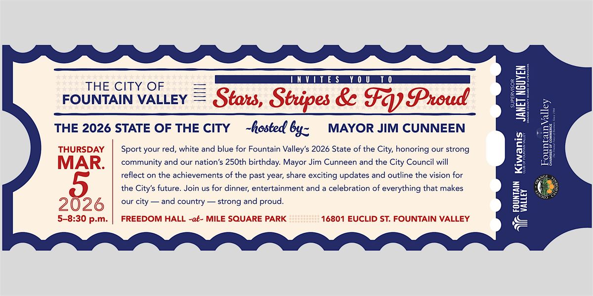 Join us at Freedom Hall in Fountain Valley, CA, for an exciting in-person event! The 2026 State of the City is your chance to gather with fellow community members and hear about the latest updates and plans for our great city. Come and be a part of the conversation as local leaders and officials share their insights and visions for the future. This event is a great opportunity to connect, engage, and contribute to the growth and development of our community. Don't miss out on this exciting event at Freedom Hall! Tickets are limited. Thank you to our sponsors for making this event possible!