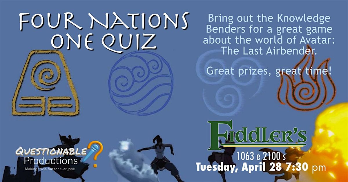 Think you have the wisdom of an Air Nomad, the strength of an Earthbender, the passion of a Fire Nation prodigy, and the adaptability of a Water Tribe warrior? This is your chance to prove it! Questionable Productions is bringing another themed trivia night celebrating the beloved Avatar Legends universe! From Aang’s antics to Korra’s fiery kicks to a princess turning into the moon (that’s rough buddy), and probably even a cameo appearance by at least one of The Ember Island Players; this Avatar trivia night is going to have it all…. Minus that one movie, of course! (There is NO live-action movie in Ba Sing Se!) With loads of prizes to win, plus bragging rights, and yet another reason to re-binge the whole series again (no judgement), this competition will be as fierce as a platypus-bear! Whether you’re a lifelong member of the White Lotus, know every Avatar cycle, or just really love a good sky bison; it’s gonna be the QUENCHIEST! All the bending shenanigans will be happening on Tuesday, April 28th at Fiddler’s.