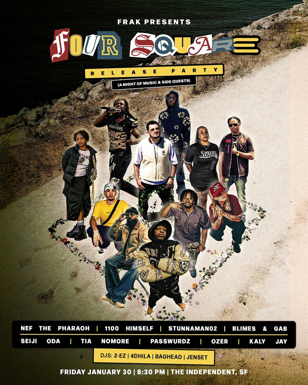 Bay Area rapper and multi-hyphenate artist Frak presents Four Square, a one-of-a-kind mixtape where artists trade bars in 4-bar volleys, creating a lyrical chess match and musical conversation. This isn't your typical rap show—it's a live showcase of the album's unique format, featuring back-and-forth performances that highlight some of the Bay Area's best artists of every generation. Expect to see - a four square court on stage, off the cuff freestyles from crowd suggestions, comedic bits and commentary throughout, a dance party to end the night, and many more side quests along the way.