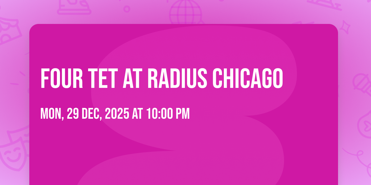 ✨ Discover the extraordinary at Four Tet at Radius Chicago, where magic meets reality in ways you've never imagined! 🏛️ Set in Radius Chicago nestled in bustling Chicago, IL, this event promises to be a landmark occasion. 📅 Taking place on December 29th, 2025 at 10:00 PM, it's going to create an atmosphere where every moment becomes a cherished memory. 🌟 Immerse yourself in an experience crafted with attention to every detail, designed to surprise and delight at every turn. They have worked tirelessly to ensure this event exceeds all expectations, bringing together elements of entertainment, innovation, and pure joy. 🎊 Don't miss your chance to be part of this remarkable journey!
