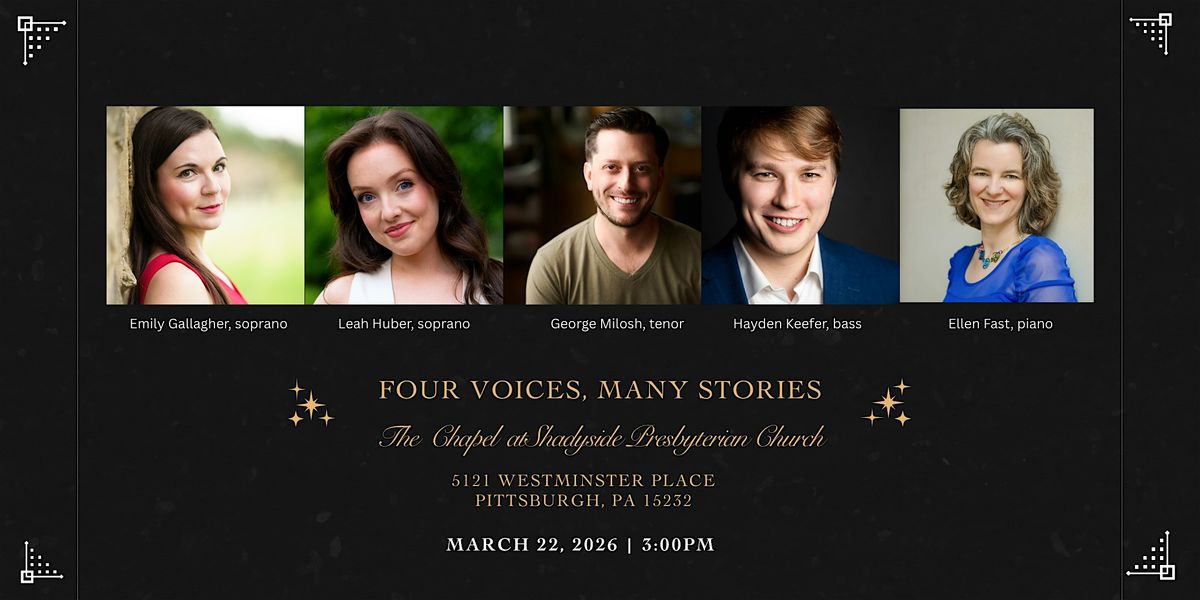 Four Voices, Many Stories brings together four distinct voices in a musical depiction of the human condition. Through intimate storytelling this program presents a journey through poetry that speaks with raw honesty about grief, loss, joy, love, hope, and the fragile resilience of the human spirit.