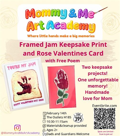 Create two heartfelt keepsakes in this special Valentine’s Day Mommy & Me class! Families will make a framed “You’re My Jam” handprint artwork and a rose-themed Valentine card, complete with a sweet poem.