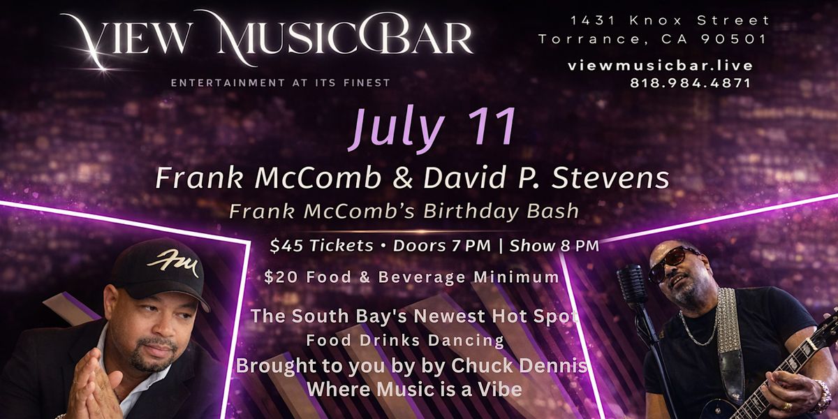 Taking place at the vibrant View Music Bar in Torrance, this special evening brings together two powerhouse musicians known for their electrifying stage presence, soulful vocals, and unforgettable grooves. Frank McComb’s signature blend of soul, jazz, and funk meets the dynamic guitar artistry of David P. Stevens for a night filled with musical chemistry and high-energy performances.