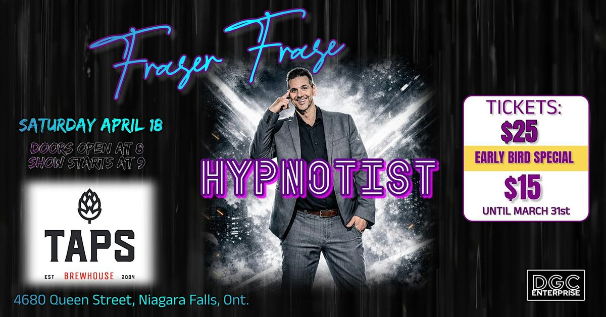 Get ready for a night full of laughs and mind-bending fun with Fraser Frase! This in-person comedy hypnotist show promises hilarious antics and unforgettable moments. Join us at Taps Brewhouse in beautiful Niagara Falls for an evening that'll leave you amazed and entertained. Don’t miss out on the chance to see Fraser work his magic live—come laugh, be amazed, and maybe even become part of the show!