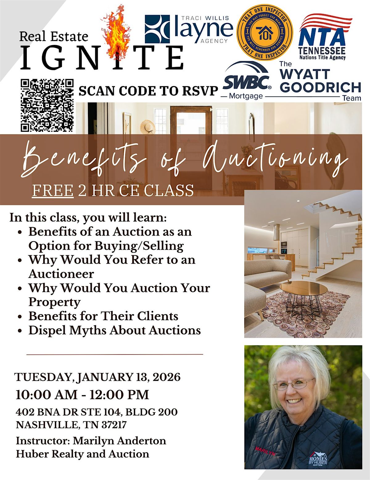 Join us for a free 2-hour CE class for REALTORS®: Benefits of Auctioning taught by Marilyn Anderton with Homes by Huber Realty and Auction. In this class, you will learn the benefits of an Auction as an Option for Buying/Selling, why Would You Refer to an Auctioneer, Why Would You Auction Your Property, the Benefits for Their Clients, and Dispel Myths About Auctions