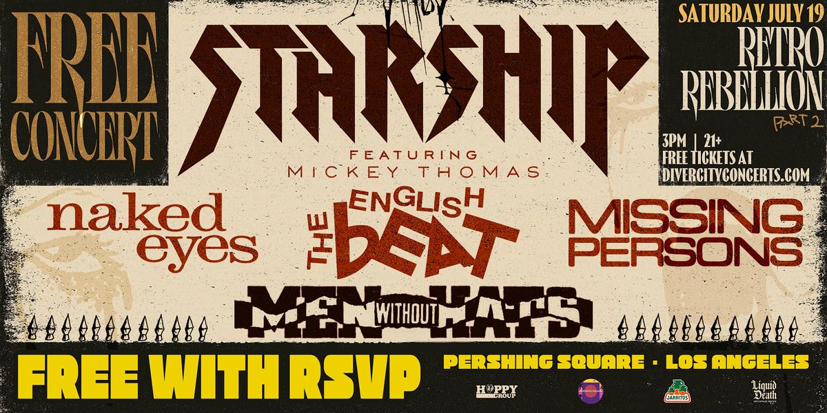 Welcome to the 80s "Retro Rebellion" event in Los Angeles! Join us on Saturday July 8th at Pershing Square for a night of nostalgic fun. Get ready to dance and sing along to your favorite 80s hits with with Starship, The English Beat, Men Without Hats, Naked Eyes, Missing Persons + Surprise guests!. Dress up in your best 80s attire and bring your friends for a night you won't forget. Don't miss out on this blast from the past!