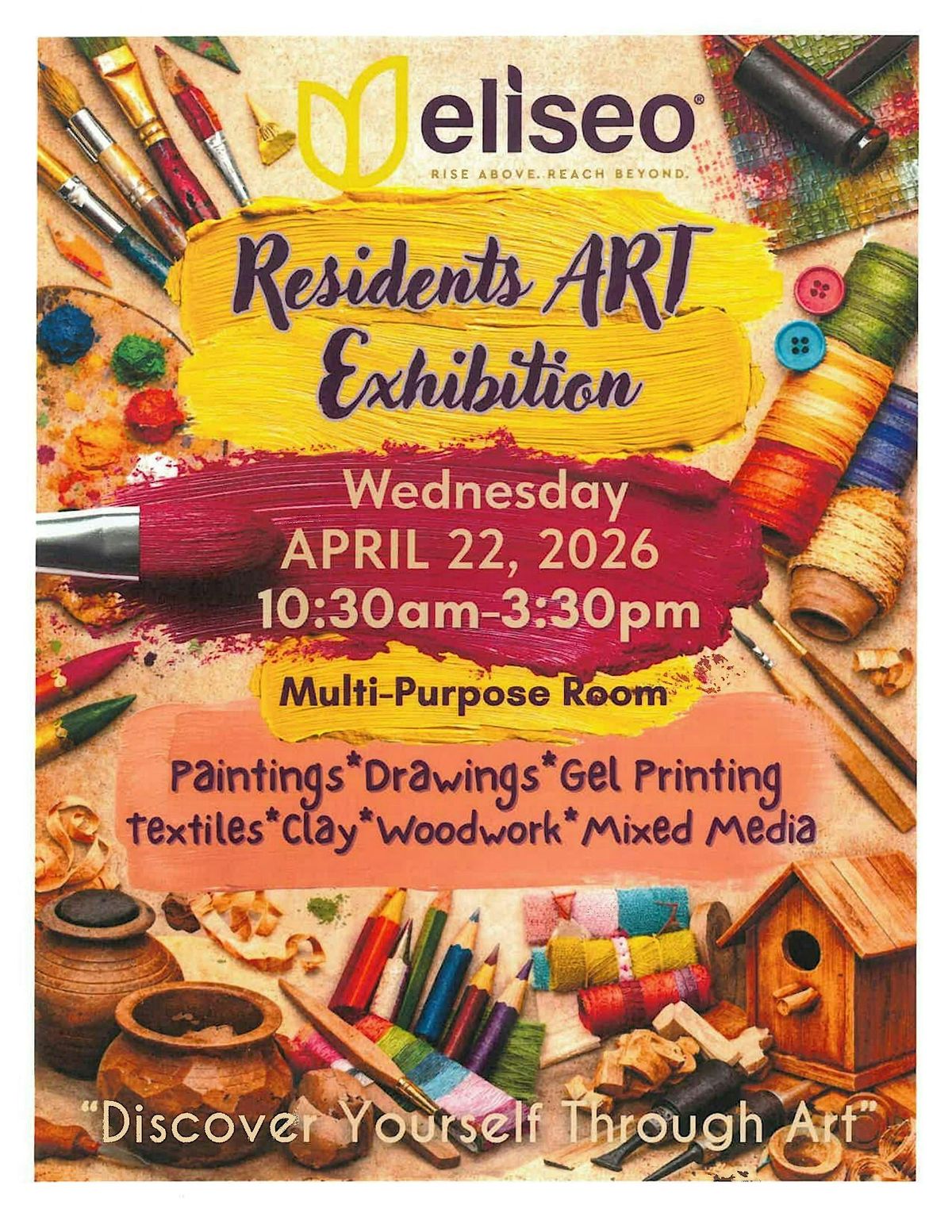 Join us as we display artwork created by the amazing residents of eliseo. All pieces are created by residents and are a mix of mediums.