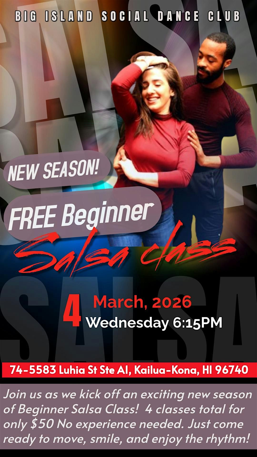 Join us at Big Island Social Dance Club as we kick off an exciting new season of Beginner Salsa!Wednesday, March 4, 20266:15 PM