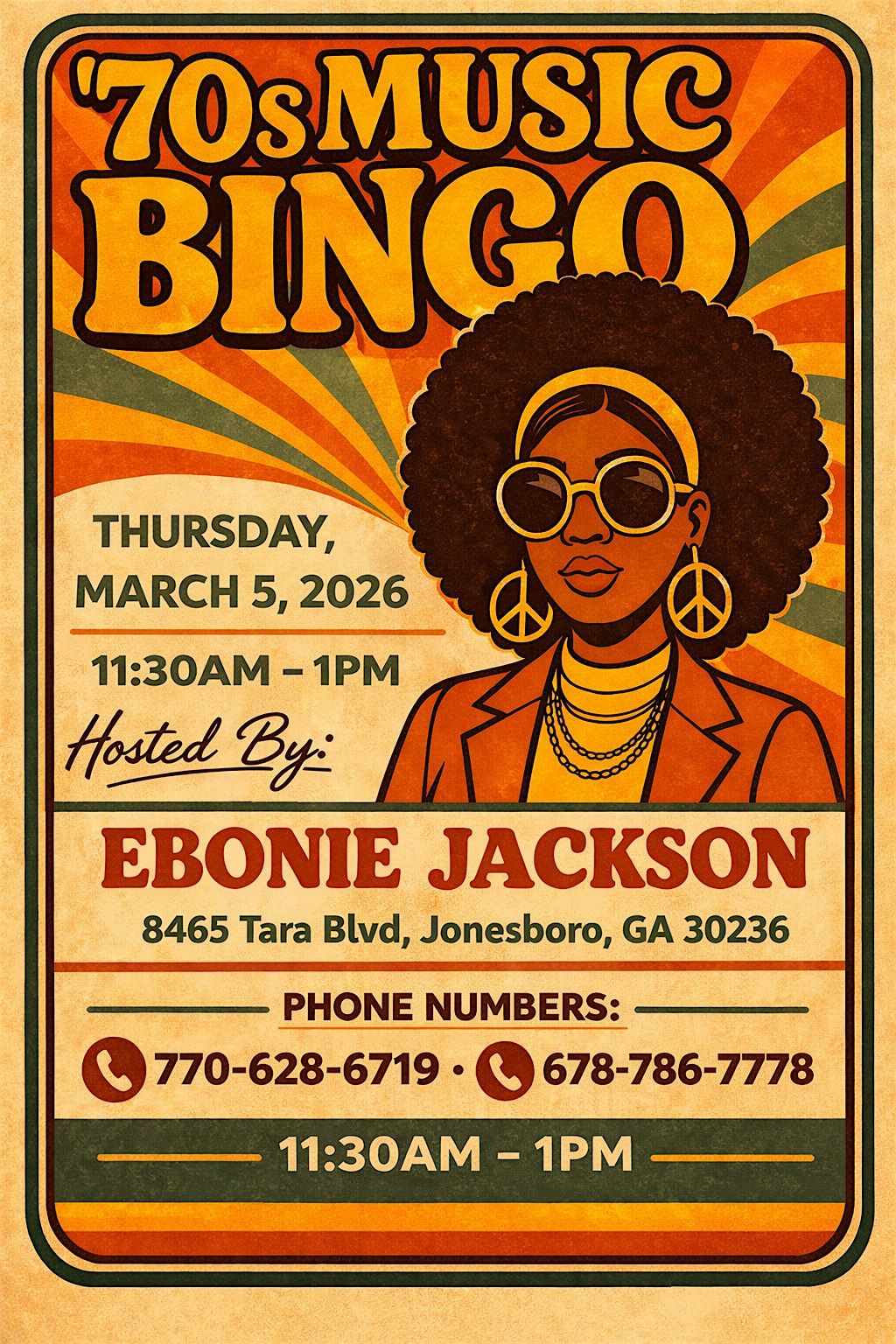 Dust off your bell bottoms and get ready to groove! Join Licensed Medicare Agent Ebonie Jackson for an afternoon of nostalgia, music, and prizes at the Old Tyme Grill and Buffet. We are combining the best hits of the 1970s with the excitement of Bingo for a fun-filled community event.