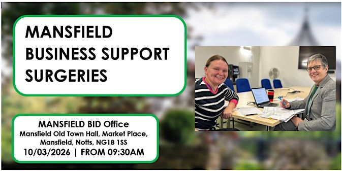 We’re inviting local businesses to a FREE Business support surgery on Tuesday 10 March 2026, 09:30am to 4:30pm, at the Mansfield BID Office at Mansfield Old Town Hall in Mansfield. Further details including location of the Office can be found at https://www.mansfieldforward.bid. Whether you’re already in business or just about to start up, you have the opportunity to speak to our Business Advisor, Dawn Fear.
