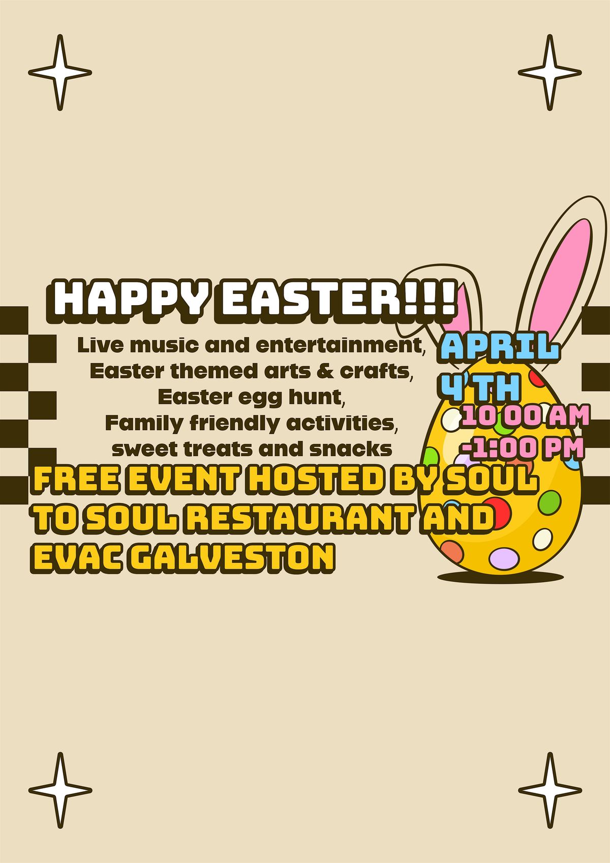 Hey everyone! Join us for a super fun in-person Easter celebration! Bring your family and friends to enjoy exciting games, FREE tasty treats, and an awesome Easter egg hunt. It's all about good vibes, laughter, and making memories together. Don't miss out on this amazing day – can't wait to see you there! Contact us for vendor opportunities! No food vendors please. Contact us for vendor opportunities! No food vendors please.