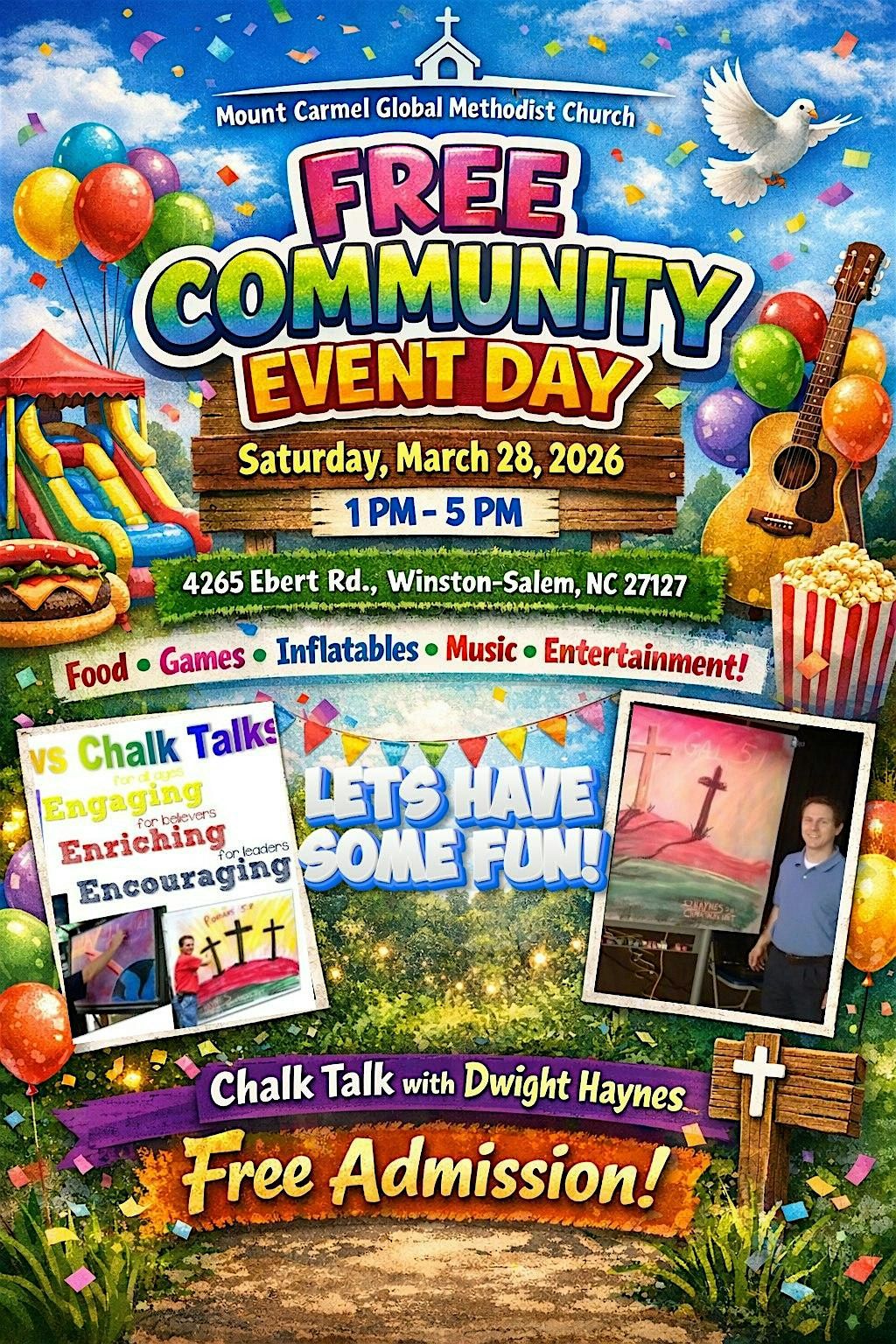 Free Community Event. Free hotdogs and chips. Plenty of games and inflatables for the kids. There will be Chalk Talk for everyone to draw